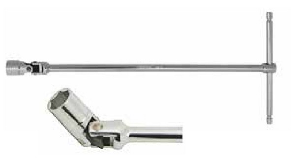 Chiave a T snodata con asta scorrevole Misura mm 8 Lunghezza mm 395 In acciaio al Cromo Vanadio Finitura cromata lucida Bussola profonda con bocca esagonale Snodo cardanico a spina elastica Accoppiamento preciso e stabile UNI 6743 - ISO 2236 - DIN 896