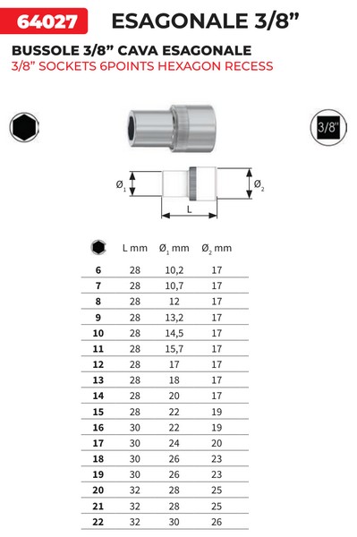 Assortimento di 12 bussole a macchina standard in millimetri Attacco quadro 3/8" In acciaio al Cromo Molibdeno Bocca esagonale Per utilizzo con avvitatori ad impulso HRC 40/44 Lunghezza bussole mm 32 Fornite con guida portabussole in alluminio Misure mm 8, 9, 10, 11, 12, 13, 14, 15, 16, 17, 18, 19