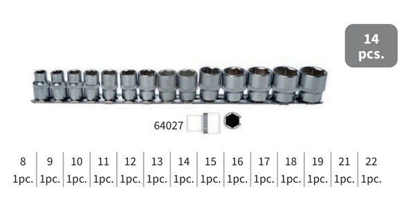 Assortimento di chiavi a bussola con attacco quadro 3/8" Composto da un totale di 14 pezzi Bussole poligonali in acciaio al Cromo Vanadio con attacco quadro 3/8" da mm 8 a mm 22 Misure: 8, 9, 10, 11, 12, 13, 14, 15, 16, 17, 18, 19, 21, 22 Lunghezza bussole mm 28 (8-15), 30 (16-19), 32 (21-22) Fornito su guida portabussole in alluminio Dimensioni mm 200x35x18