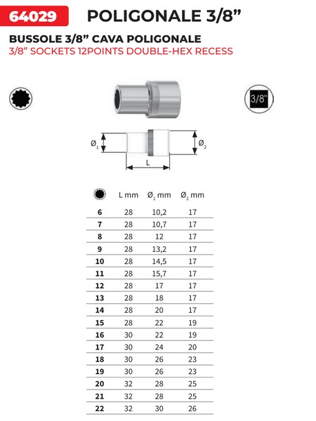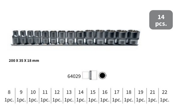 Assortimento di chiavi a bussola con attacco quadro 3/8" Composto da un totale di 14 pezzi Bussole esagonali in acciaio al Cromo Vanadio con attacco quadro 3/8" da mm 8 a mm 22 Misure: 8, 9, 10, 11, 12, 13, 14, 15, 16, 17, 18, 19, 21, 22 Lunghezza bussole mm 28 (8-15), 30 (16-19), 32 (21-22) Fornito su guida portabussole in alluminio Dimensioni mm 200x35x18