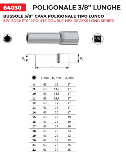 Assortimento di chiavi a bussola lunghe con attacco quadro 3/8" Composto da un totale di 14 pezzi Bussole lunghe esagonali in acciaio al Cromo Vanadio con attacco quadro 3/8" da mm 8 a mm 22 Misure: 8, 9, 10, 11, 12, 13, 14, 15, 16, 17, 18, 19, 21, 22 Lunghezza bussole mm 63 Fornito su guida portabussole in alluminio Dimensioni mm 200x35x18