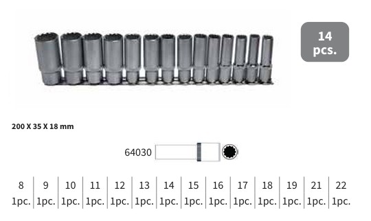 Assortimento di chiavi a bussola con attacco quadro 3/8" Composto da un totale di 14 pezzi Bussole poligonali in acciaio al Cromo Vanadio con attacco quadro 3/8" da mm 8 a mm 22 Misure: 8, 9, 10, 11, 12, 13, 14, 15, 16, 17, 18, 19, 21, 22 Lunghezza bussole mm 28 (8-15), 30 (16-19), 32 (21-22) Fornito su guida portabussole in alluminio Dimensioni mm 200x35x18