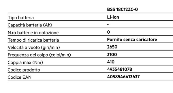Trapano avvitatore a percussione a batteria ad alte prestazioni della famiglia AEG PRO18V SubCompact La gamma SubCompact garantisce la completa compatibilità con tutti gli utensili della gamma PRO18V Compatto e potente, in grado di erogare fino a 110 Nm di coppia Batteria al litio 18V 5Ah 2 velocità: 0 - 500 / 0 - 2100 giri/min Motore senza spazzole Brushless più compatto e con fino al 50% di autonomia in più rispetto al motore con le spazzole tradizionale Mandrino autoserrante 13 mm in metallo Fino a 31.500 colpi al minuto in modalità percussione 24 regolazioni di frizione per un controllo efficace in avvitatura Progettato per la migliore ergonomia e il massimo comfort dell'utilizzatore LED per illuminare l’area di lavoro Alimentazione tramite batteria PRO Lithium Ion con tripla protezione, per la massima durata sia dell’utensile che della batteria Capacità di foratura nel legno mm 65 Capacità di foratura nel metallo mm 13 Capacità di foratura nella muratura mm 13 Gli utensili della nuova gamma AEG SubCompact sono fino al 30% più compatti e garantiscono la stessa eccezionale autonomia e potenza della gamma PRO18V in dimensioni ridotte Rivoluzionario sistema a batteria agli ioni di litio PRO18V La tecnologia AEG Lithium-Ion garantisce la massima protezione dell'utensile e della batteria grazie all'impiego di tre innovativi sistemi di protezione: monitoraggio cella, protezione elettronica e protezione termica Fornito in valigetta completo di 2 batterie 18V 5.0 Ah e caricabatterie Scheda completa