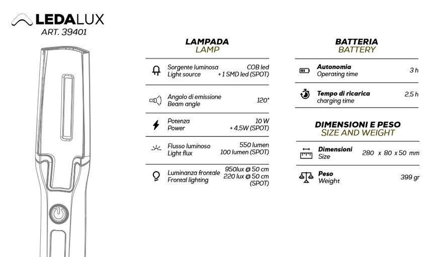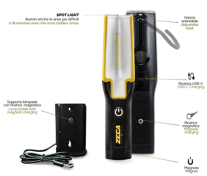 Nuova lampada a led professionale Zetec by Zeca Lampada versatile e multifunzione dotata di due fonti luminose Spot led con funzione torcia Potente luce da lavoro regolabile in 2 intensità (50%, 100%) La testa può essere piegata fino a 210° e ruotata fino a 360°, consentendo di adattare il flusso di luce verso qualsiasi direzione Un robusto gancio retrattile e il magnete integrato completano la maneggevolezza della lampada Realizzata in tecnopolimero ad alta resistenza Alta protezione contro i getti d’acqua,la penetrazione di polvere e gli urti Fornita completa di cavo di carica USB Sorgente Luminosa: COB + LED (SPOT) Potenza: 6W - 3W Flusso luminoso: 700/300 Lumen Luminanza frontale: 900/250 lux @ 50 cm Batteria 3,7 Li-ion - 2600 mAh Autonomia batteria: 3,5 h Tempo di ricarica: 2,5 h Resistenza agli urti IK07 Grado di protezione IP65 Dimensione: 120x50x35 mm Peso: 190 gr