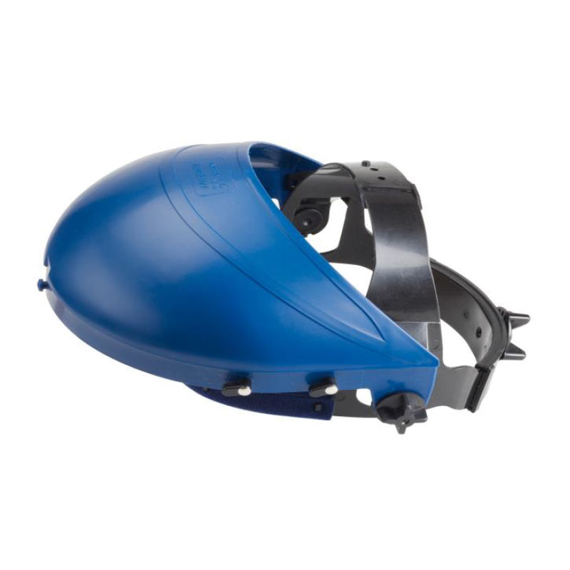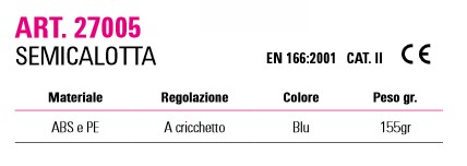 Visiera protettiva profesionale in policarbonato incolore completa di semicalotta in Abs EN 166:2001 CE CAT II Caratteristiche Visiera: In policarbonato trasparente Riparo laterale ripiegato Classe ottica 1 Protezione da particelle ad alta velocità a temperature estreme (-5°C / +55°C), impatto a media energia (BT) Protezione contro metalli fusi e solidi caldi (9) Dimensioni: H 200 x L 400 mm Peso: 100 gr. circa Caratteristiche semicalotta: In ABS Regolazione nucale a cremagliera Regolazione superiore a tacche Fascetta parasudore in spugna e tessuto Protezione contro gli spruzzi di liquidi (3) Protezione da particelle ad alta velocità a temperature estreme (-5°C / +55°C), impatto a media energia (BT) Misura: 51 – 62 cm (circonferenza della testa) Peso: 155 gr circa