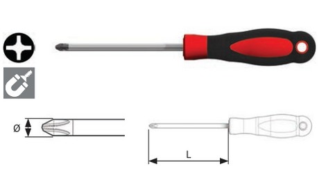 Giravite professionale con lama esagonale fosfatizzata per viti a croce Phillips Testa manico rinforzata per uso a percussione Lama in acciaio T-Moly Vanadio Plus HRC 59-61 DIN ISO 8764 Impugnatura ergonomica in bicomponente Codice e simbolo identificativo riportato sull'estremità del manico Punta fosfatizzata Punta PH 2 Lunghezza lama (L1) mm 100 Lunghezza totale (L2) mm 216 Peso gr 120 Impugnatura "L" mm 116x38 La nuova linea di cacciaviti Plus Line presenta una lama più robusta ma nel contempo più flessibile, grazie all'innovativa lega di acciaio di cui è composta, arrivando a garantire il 20% di performance in più Il design del manico in bicomponente assicura più potenza e velocità nella torsione I nuovi manici hanno un'ergonomia innovativa, grazie alla combinazione del grip in bimateriale con un volume del manico più ampio che consente maggiori comfort e capacità di torsione I manici sono inoltre modellati attorno alla lama per assicurare perfetta aderenza nel momento della torsione, consentendo così alla mano un movimento meno faticoso