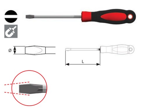 Giraviti professionali per viti a intaglio Linea Ergofort Lame in acciaio speciale al silicio tipo SVCM Impugnatura ergonomica bimateriale Codici e simboli identificativi di taglio e modello riportati sull'estremità del manico UNI 10562 - ISO 2380 - DIN 5264 A richiesta sono fornibili anche le dimensioni non disponbili Articolo Misura mm Lunghezza mm 300.T2,5x50 2.5 x 50 120 300.T2,5x75 2.5 x 75 145 300.T3x75 3 x 75 145 300.T3x100 3 x 100 170 300.T3,5x75 3.5 x 75 145 300.T3,5x100 3.5 x 100 170 300.T4x100 4 x 100 170 300.T4x125 4 x 125 195 300.T4x150 4 x 150 220 300.T5,5x100 5.5 x 100 200 300.T5,5x125 5.5 x 125 225 300.T5,5x150 5.5 x 150 250 300.T5,5x200 5.5 x 200 300 300.T6,5x125 6.5 x 125 235 300.T6,5x150 6.5 x 150 260 300.T6,5x200 6.5 x 200 310 300.T8x150 8 x 150 272 300.T8x175 8 x 175 297