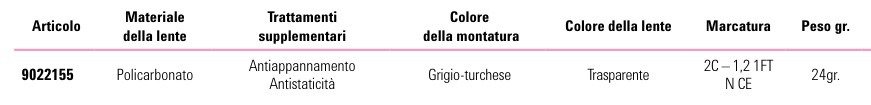 Nuova linea di occhiali antinfortunistici che punta a disegnare un nuovo standard di sicurezza, in cui comfort ed estetica si coniugano con una protezione meccanica di alta qualità per ciò che concerne la protezione della vista Occhiale sportivo altamente flessibile, robusto e confortevole che rimane sul viso senza esercitare pressione Bordo interno e supporto nasale completamente gommati per aumentare la resistenza allo scivolamento Profilo di gomma nella parte alta della montatura per protezione dall'ingresso di corpi estranei dall’alto Elevata curvatura della lente per evitare distorsioni dovute alla presenza di angoli, senza rinunciare alla protezione laterale ed ad un elevato assorbimento dell’impatto La distanza tra l'occhio e la lente è regolabile Supporto nasale adattabile alla dimensione del naso Ultraleggero (24 grammi) Campo visivo illimitato Elevato assorbimento dell’impatto Lenti grigie in policarbonato Protezione UV: 100% Ideali per uso all'aperto e/o sportivo Montatura: Nero/Turchese Stanghette: Easy Fit Soft–gommate antiscivolo Protezione AF - AS: rivestimento antigraffio interno/esterno lente, antiappannamento e antistatico Conforme EN 166 CE Marcatura Montatura: GA 166 FT CE Marcatura Lenti: 5 - 2,5 GA 1 FT N CE