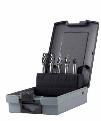 Assortimento di 5 frese rotative in Metallo Duro in cassetta di ABS antiurto Composto da 5 frese di forma diversa Ø 10 mm Le forme delle frese presenti nell'assortimento sono: cilindrica con taglio frontale, conica a punta, ogiva a punta, sferica e clindrica con testa sferica Testa in metallo duro K20 con taglio incrociato HM4 Taglio incrociato HM4 per lavorazioni anche intensive di finitura su acciaio inox, acciaio trattato, acciaio temprato, ghisa, cordoni di saldatura e materiali metallici in genere Buon grado di finitura superficiale con ottimi rendimenti Vibrazioni ridotte Velocità consigliata: 450÷600 m/min Lunghezza totale: mm 65 Lunghezza frese: mm 18 (sferica mm 8) Attacco cilindrico Ø 6 mm