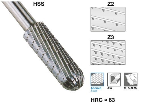 Fresa rotativa professionale in acciaio super rapido con forma semisferica Taglio Z3 mezzo dolce per acciai e ghisa Velocità consigliata: 60-180 m/min Dimensioni fresa (Øxlunghezza) mm 15x30 Lunghezza totale mm 70 Confezionata singolarmente Codolo Ø mm 6