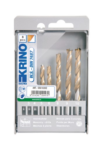 Assortimento di punte per muro ad alto rendimento In astuccio di plastica Composto da 8 punte Ø 3, 4, 5, 6, 8, 9, 10, 12 mm Punte elicoidali con codolo cilindrico in metallo duro HVA 1650 Corpo fresato con scanalatura ad “L” ad alta evacuazione Placchetta M.D. resistente alla forte percussione Brasatura con lega saldante a 1100° C Angolo di taglio 130° Per forare a forte percussione il muro, il cemento, il calcestruzzo, marmo, pietre. Idonee per un uso intensivo ad alto rendimento DIN 8039 - ISO 5468