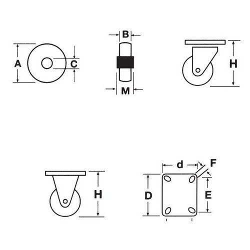 Ruote con dischi in lega di alluminio pressofuso e rivestimento in poliuretano serie BPU ad alta portata Mozzo con cuscinetti a sfere e supporti girevoli e fissi zincati Massima scorrevolezza Supporto fisso Colore: Rosso Diametro ruota (A) mm 160 Larghezza ruota (B) mm 50 Diametro foro (C) mm 20 Larghezza totale (M) mm 58 Altezza totale (H) mm 197 Larghezza piastra (Dxd) mm 146x107 Interasse dei fori di fissaggio (Exe) mm 105x80 Dimensione fori di fissaggio (F) mm 11x13 Portata 320 kg