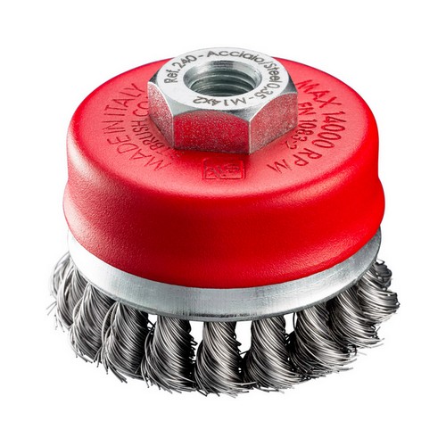 Spazzola a tazza per smerigliatrice In filo ondulato ad alta resistenza Ideale nella pulizia di superfici metalliche, legno, gomma, pietre e marmo Utilizzabile anche in macchinari appositi Applicazione: Sbavature leggere, satinature, pulizia di piccole scorie e ruggine, sbavature di testate di tubi Le spazzole TECH si distinguono per la maggiore densità di filamento, per la qualità dei materiali e per la presenza di elementi tecnici migliorativi della performance Fili in acciaio 0,35 mm Diametro spazzola (D): 80 mm Altezza spazzola (S): 25 mm Foro (F): M14 Max Rpm: 14000
